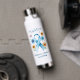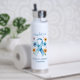 Una botella de agua personalizada de color azul bonito adornada con una cinta de reconocimiento de la salud azul claro rodeada de flores acuáticas para ayudar a difundir el conocimiento de este trastorno endocrino llamado Enfermedad de Addison o Insuficiencia Adrenal.