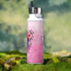 Botella de agua personalizada. Hermoso cono de helado rosa y dorado con flores moradas hecho al estilo acuarela ai art.