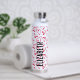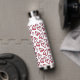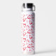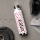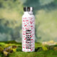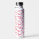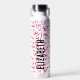 Los corazones rojos dibujados a mano cubren esta botella de agua personalizada con su nombre impreso verticalmente en letras de moda.