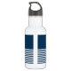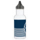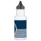 Diseño de temática náutica con símbolos náuticos (ancla, velero, velero, brújula) sobre fondo rayado blanco y azul marino.