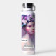 Arte inspirador sobre botellas de agua. Alentamiento. Hermosa doncella asiática con flores en el pelo tocando el piano. Notas musicales y fondo morado floral. Arte femenino generativo