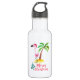 Botella de agua festiva con una linda ilustración de un flamingo rosado en un sombrero de santa roja. Junto a una palmera verde sobre un montón de arena amarilla. Se coloca un diseño de flamante árbol de navidad junto al texto Feliz Navidad. Escrito en el color rosa en un lujoso tipo de letra manuscrita.