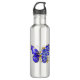 Joyería, azul, zafiro, mariposa floral brillante con ala decorada con flores azules y preciosas con hojas de oro sobre fondo blanco.