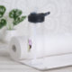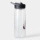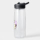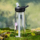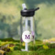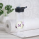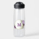 Hermosa botella de agua con flores de color lila y berenjena y hojas verdes