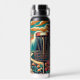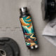 Un campo de golf único y colorido en un campo de setas retro, pinos y nubes de colores vintage como el naranja, el azul y el rojo.