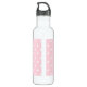 Botella de agua con una adorable imagen de huellas de bebé rosadas con un contorno blanco pesado y puntos de polka blanco sobre un fondo rosado detrás del ilustracion.