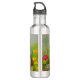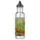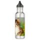 Botella de agua con un gato sonriente. Este gato gracioso está jugando en un jardín de flores rosas, naranjas, rojas y azules. Un regalo extraordinario para los amantes del gato y del arte victoriano.