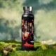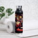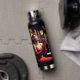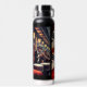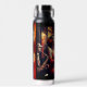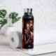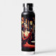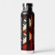Botella de agua aislada con una pintura de un jazz o una orquesta de escucha fácil con un cantante con un hermoso vestido rojo. El fondo muestra una representación artística de un teclado. Puede añadir sus propias iniciales u otros textos si lo desea.