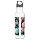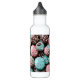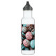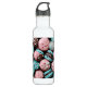 Macarón rosa, azul y chocolate con una botella de agua deliciosa aspersante.