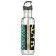 En esta elegante botella de agua, un elegante patrón de quatrefoil sobre un fondo turquesa con una brillante cinta dorada donde se puede personalizar y al lado de la cinta, un diseño de jirafa exótica que crea vibraciones de moda a la moda.