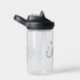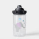 Una botella de agua para niños con un elefante cómico con grandes orejas de lavanda soplando burbujas. Personaliza con el nombre del niño.