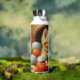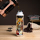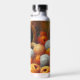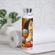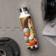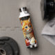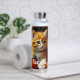 Botella de agua personalizada. El gatito a rayas naranja dulce jugando en una canasta de bolas de hilo naranja y blanco.