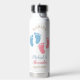 Esta botella de agua personalizada está bien diseñada para invitaciones gemelas y tiene huellas de bebé rosas y azules, nombres y fecha de vencimiento. Una encantadora idea de regalo para los padres gemelos, el embarazo revela, o un personalizado agudo para apreciar este hito.