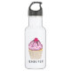 Botella de agua personalizada con un nombre con el ilustracion de un delicioso quequito. Escarcha rosa y lloviznas de chocolate. Un portapapeles amarillo y una frambuesa encima. ¡Yummy!