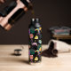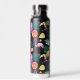 Una botella de agua divertida te lleva de la casa a la playa o a cualquier otro lugar. Presenta un patrón de imágenes tropicales que incluye limones y rodajas de pomelo, hojas de palma, helados helados helados, un pájaro toscano y, por supuesto, un flamingo rosa. El patrón se coloca sobre un fondo negro dramático.