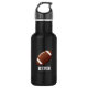 Botella de agua negra de gran aspecto, con gráficos de balones de fútbol marrón y blanco, en el medio. Personalizado qué texto, en el frente, está listo para personalizar para ti o para tu fan o jugador de fútbol favorito.