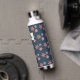 A chic and functional insulated water bottle featuring a dark blue background with a playful, repeating pink and gray floral pattern. It is personalized with a white framed patch reading "Mrs. Victoria." This elegant bottle is a wonderful gift for a newlywed, teacher, or anyone who enjoys feminine, stylish hydration.