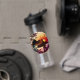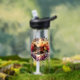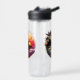 Esta botella de agua es perfecta para los surfistas. Es de estilo retro con una escena playera al atardecer de un surfista con tablas de surf en primer plano.