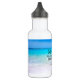 Una botella de agua boda conmemorativa Mr & Mrs con una playa tropical de arena. A lo lejos, un magnífico mar turquesa de aguas cristalinas acaricia una playa de arena. Un cielo azul brillante en el fondo.