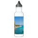 Botella de agua personalizada con una hermosa foto con un complejo de playa tropical. agua azul bonito y playa de arena blanca con cabañas de paja que le confieren un ambiente tranquilo a la isla.