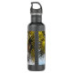En un ambiente tropical, la fotografía original de MaeFlowers en esta botella de agua muestra la parte superior de una palmera con sus ramas y el tronco bañados en el cálido resplandor del sol de la tarde. Las ramas largas y puntiagudas en el fondo son de color verde oscuro, y se extienden como fans. Las ramas en primer plano son de color amarillo claro, curvándose hacia el exterior mientras captan la luz del sol. El tronco del árbol, normalmente de color marrón medio, parece casi naranja a última hora de la tarde. Un fondo azul pálido del cielo azul acuático separa los ricos tonos tierra de la palmera y completa la escena tropical.