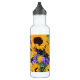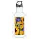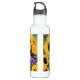 ¡Los girasoles de oro son fijados apagado por púrpuras y verdes para crear una botella de agua hermosa y alegre!