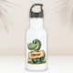 Esta fantástica y alegre botella de agua cuenta con un simpático dinosaurio t-rex verde ligeramente regordete, ¡que lleva un gran signo de nombre de piedra texturizado para su personalización!