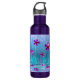 Dibujo digital de flores moradas lindas y estilizadas con brillantes centros rojos. Te miran curiosamente desde la hierba alta junto a una piscina de agua transparente.