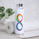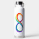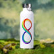 Símbolo claro de infinito de capas plásticas de colores saturados rojo, amarillo, verde, turquesa, azul y violeta sobre fondo blanco.