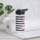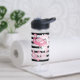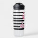 El diseño del producto presenta un flamingo con patrones de paisajes caleidoscópicos en tonos rosas sobre fondo de rayas negras. Este diseño de ave tropical con texto personalizado hace una botella de agua moderna y única.