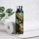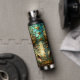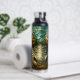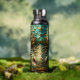 A water bottle with a cool close up illustration of a turquoise and metallic gold dragon face with realistic eyes. Fantasy art realism dragon art.