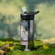 A personalized water bottle with an illustration of two horses on a snowy winter ranch with a full moon in back of them standing behind an old rustic fence.