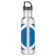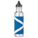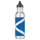 Botella de agua / uisge botánico Traducción gaélica escocés con bandera escocesa Fondo de Saltire pintado con pintura de color azul acuático.