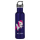 Botella de agua con unicornio alado blanco con mané rosa, cola y pezuñas. El cuerno tiene anillos de color arcoiris y se parece a una golosina de caramelo. Este lindo unicornio está criándose en sus patas traseras. El corazón rosado dulce en la mejilla y las largas pestañas de una niña.