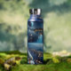 Botella de agua con tema en el espacio exterior. Ilustracion aéreo de un astronauta observando OVNIs volando en el espacio sobre la tierra.