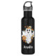 Botella de agua con una ilustración de un fantasma sonriente. Decorado con flores, arcoíris y murciélagos.