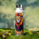 Botella de agua con tema de león. Un hermoso ilustracion ai de un león en un impresionante cristal manchado y un estilo de baldosas rotas en colores tierra como el marrón y el azul.