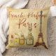 Frascos franceses de perfume vintage con texto y Torre Eiffel sobre fondo antiguo.