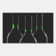 Una silueta de tres botellas negras de vino con etiquetas verdes que brillan en la oscuridad.