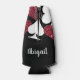 Adorna ese cuello largo con un enfriador de lata "Dama de Honor" totalmente personalizado que presenta una dispersión de trajes de cartas en brillo rojo y blanco con texto personalizado para el nombre de la dama de honor. Reúne a las chicas para celebrar a la novia con un fin de semana en la suerte de Las Vegas o simplemente una noche al estilo de Vegas.