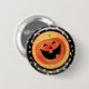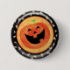 Botón del feliz Halloween con la Jack-o-linterna y las pastillas de caramelo contra un fondo negro y anaranjado.