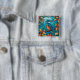 Un botón cuadrado con un pescador en otoño con un estilo de vidrio manchado.