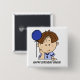 ¡Un pequeño muchacho cabelludo marrón con un globo azul y una camisa azul en un botón que usted puede modificar para requisitos particulares con su opción del texto, su nombre, y edad! ¡Perfeccione para todos que estén asistiendo a la fiesta de cumpleaños!