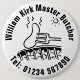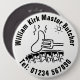 botón Carnicero Ver con tu elección del nombre de la compañía y número de teléfono. El ilustracion muestra una salchicha en un tenedor.