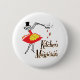 Magician de cocina. Un chef retro adorable despierta algo de magia en la cocina. En un tipo de letra ligeramente retro en negro, rojo y amarillo. Lleva puesto un vestido rojo con una delantal amarilla y su cuchara gotea brillo sobre el dicho. Otro diseño original de cocina divertida de MomsRetro.com