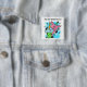 Un adorable botón de cumpleaños con un cerdo rosa en un gorra fiesta con un quequito de tamaño gigante y un espacio que puedes personalizar fácilmente con tu propio texto.