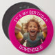 Foto y nombre del personalizable - ES MI CUMPLEAÑOS - botón. Marco rosa caliente con texto blanco.