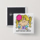 Un chica de pelo rubio con un globo rosa y una camisa azul y lavanda en un botón ¡puedes personalizar con tu elección de texto, su nombre y edad! ¡Perfecto para todos los que asisten a la fiesta de cumpleaños!