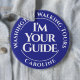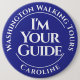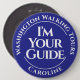 Soy tu guía de visitas. Una insignia para una guía turística oficial de la ciudad. Cambie la redacción a los detalles de su empresa. Insignia de la guía de visitas a la ciudad. Insignia oficial de la guía turística de la ciudad. Viajes y turismo. Texto blanco sobre fondo azul.