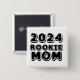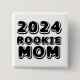 2024 Botón Rookie Mom con texto negro para mamás primerizas.